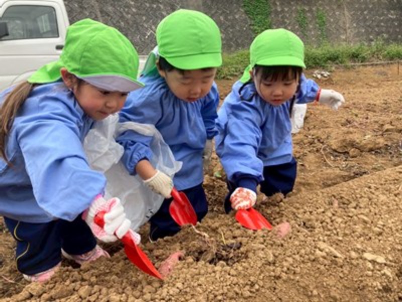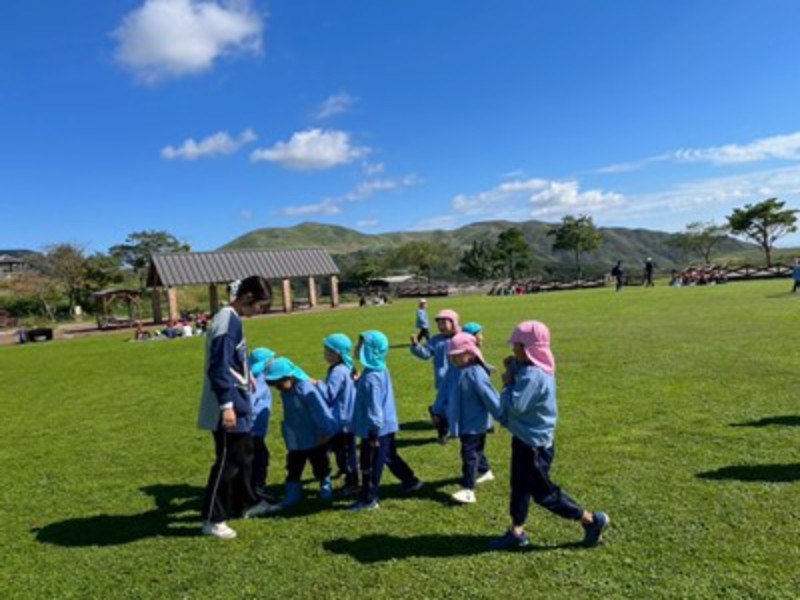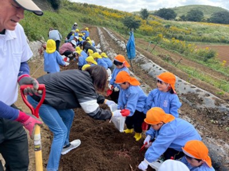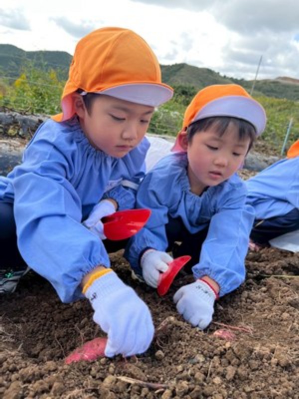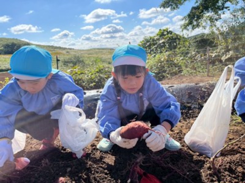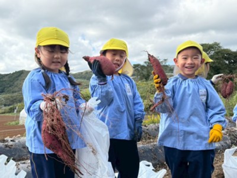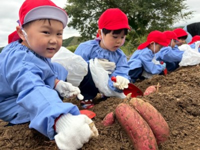 アルバム お芋堀りに行ってきました♪ 2025/10/24 秋は美味しい食べ物がいっぱいの季節ですね! いつもお世話になっている平尾台の陣内さんの畑に、今年もお芋掘りに行ってきました。今年の長く続いた暑さで心配していましたが、美味しそうなお芋が掘れましたよ! 「わあ!でてきた!」「おおきい!」「みてみて!」と土の中のお芋を一生懸命に掘って、みんな大満足でした。 お昼は、平尾台自然の郷へGO! お家からのお弁当をいただき、芝生で元気に走ったり、鬼ごっこをしたり、ハロウィンの飾りがたくさんあるお部屋にも遊びに行きました。 キタポッポにも乗って自然の郷を一周し、涼しい秋の風と自然の大地を満喫しましたよ。帰りはバスで夢の中♬きっと夢ではお芋の料理が並んでるかもしれませんね。 幼稚園でのお芋パーティーもお楽しみに♪ << 一覧に戻る