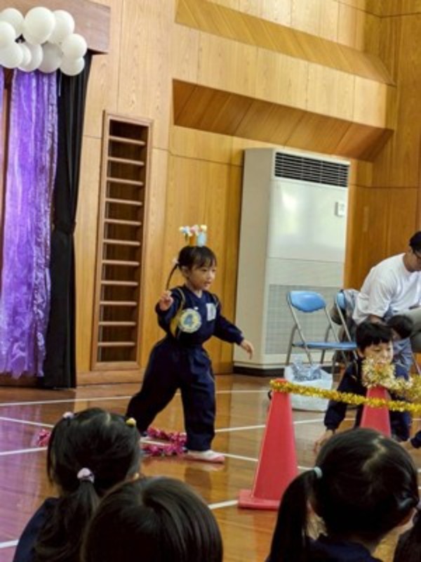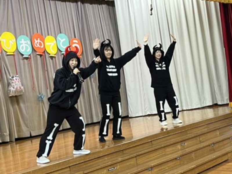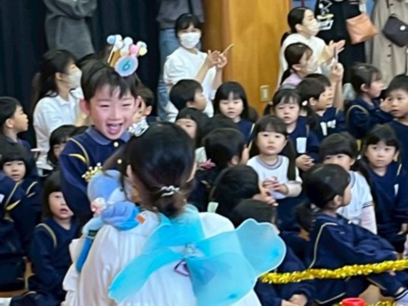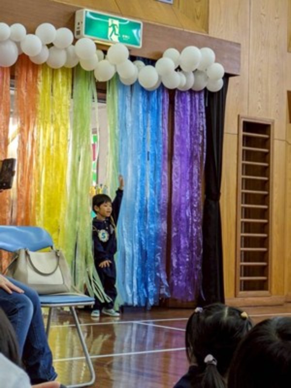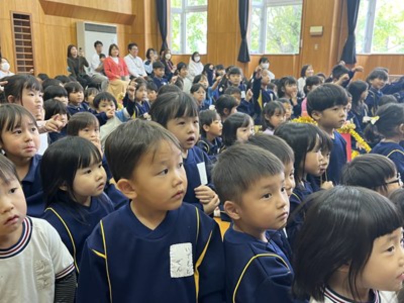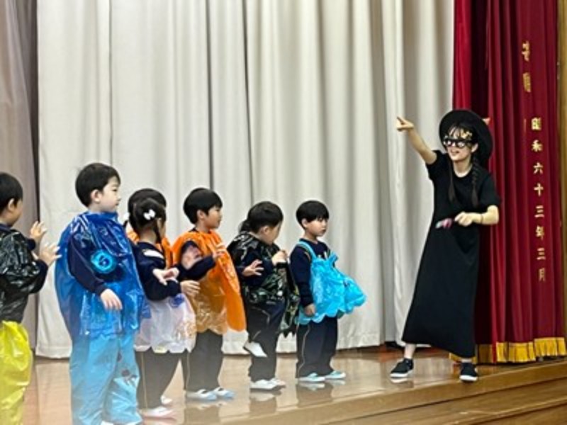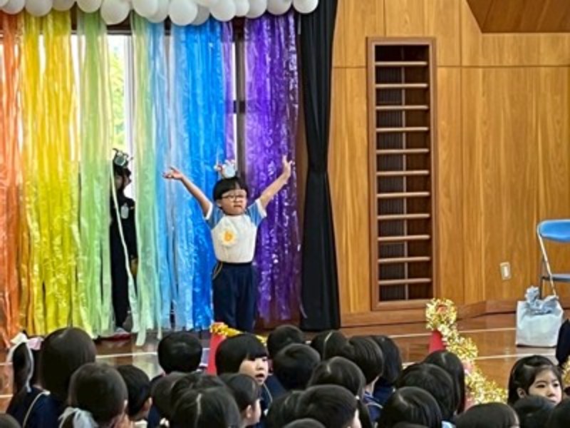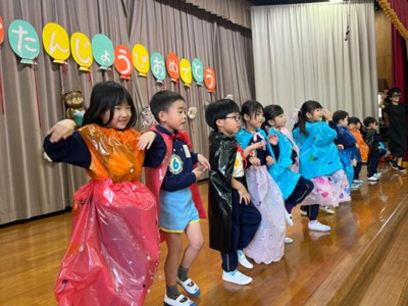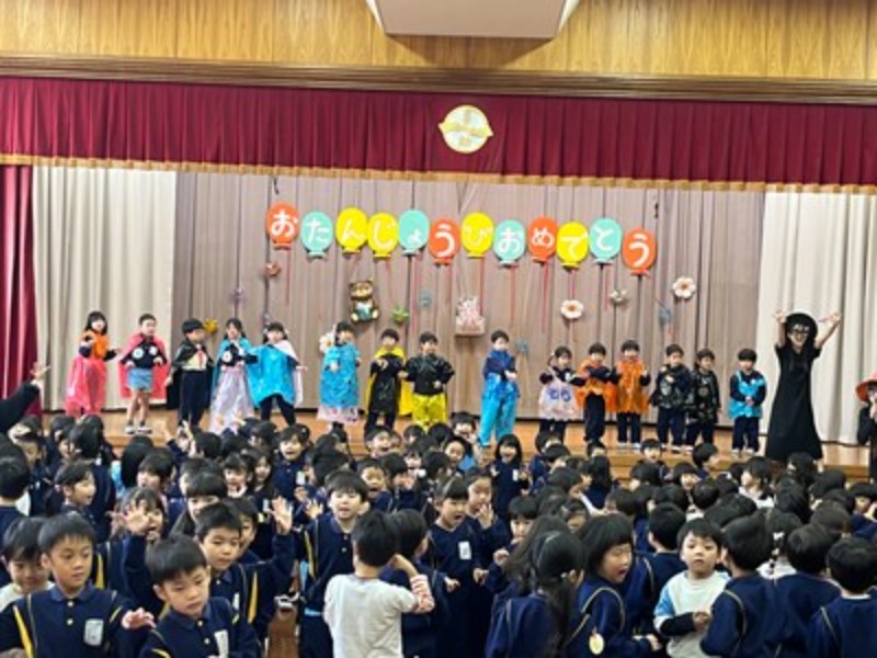 アルバム 10月お誕生会 2025/10/28 今日は10月のお誕生会。 待ちに待ったお誕生会に10月生まれさんは朝からワクワクしていましたよ。 今月から年長さんが司会をしてお誕生日のお友だちを紹介します。 「なんさいですか?」「すきなあきのたべものは?」に、元気に答えてくれました。お祝いの歌とご挨拶が終わると、遊戯室にはなんだか不思議な音楽が・・♪もうすぐハロウィン!そこで幼稚園に『魔女さん』と『ホネ骨おばけ』が遊びに来ました。ホネ骨おばけは、「おかしをくれないといたずらしちゃうぞ~」と魔女さんを連れていきそうになります。どうしようと困っていると、そこにかっこよくハロウィンの衣装を着た10月生まれさんが、魔法のキャンディーを渡してくれました!するとホネ骨おばけにかかっていった魔法が楽しい呪文と甘いキャンディーで溶けて変身!ホネ骨おばけは大好きな担任の先生たちだったのです!先生たち顔を見て、みんなは笑顔でいっぱい、みんなで面白いハロウィンダンスを踊り楽しい誕生会となりました。 10月生まれのお友だち、お誕生日おめでとうございます! 元気に大きくなってね。 << 一覧に戻る