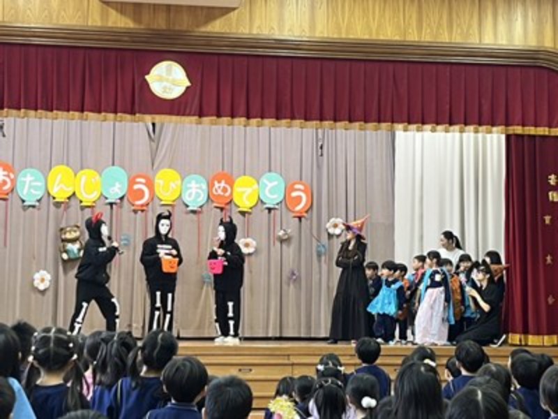 先生たち顔を見て、みんなは笑顔でいっぱい、みんなで面白いハロウィンダンスを踊り楽しい誕生会となりました。