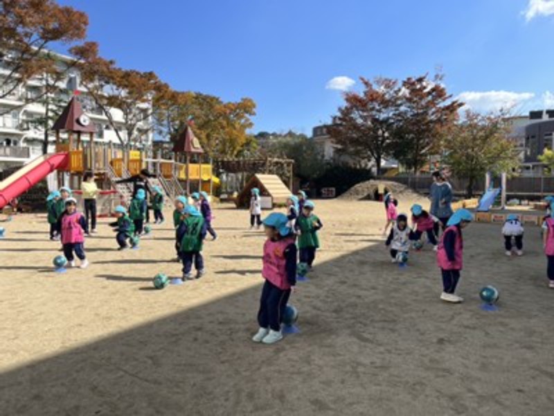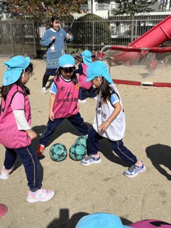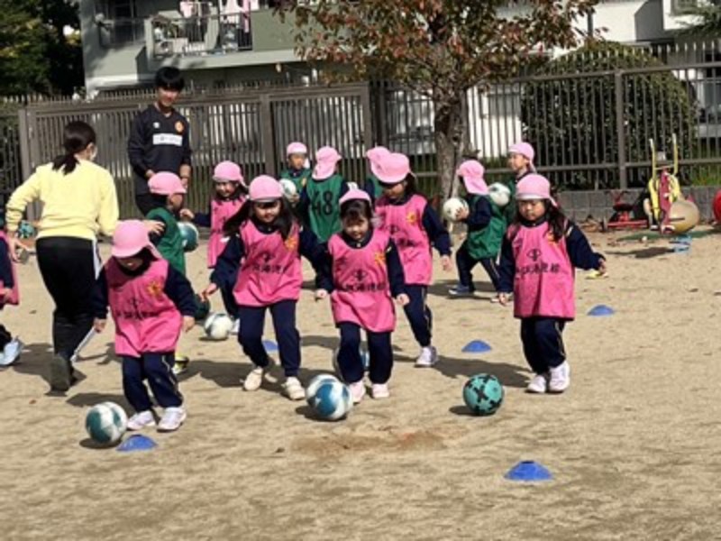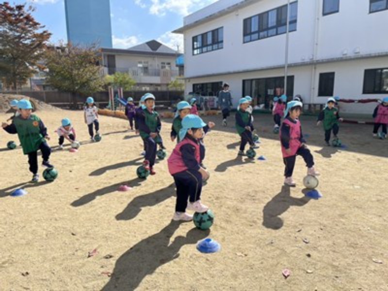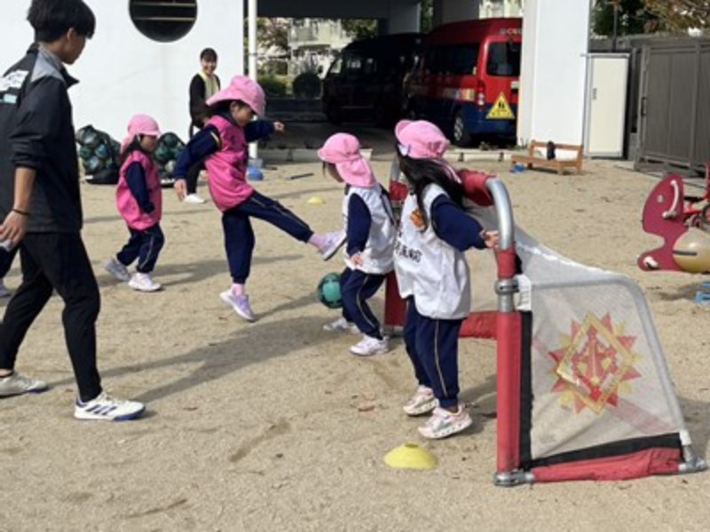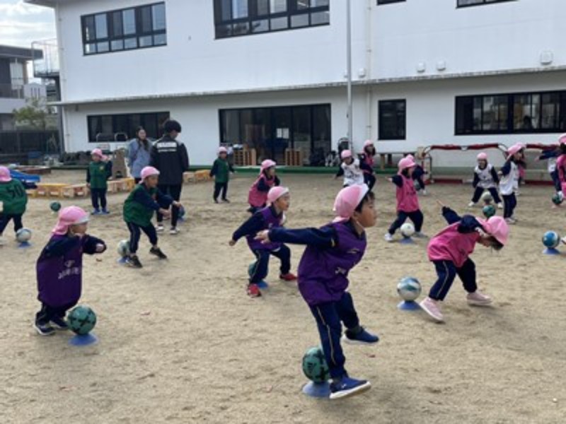 「サッカーは足を使ってするんだよ」と教えてもらって、ボールを蹴ったり、止めたりとチャレンジし、みんなとっても上手でした!
