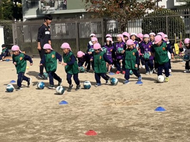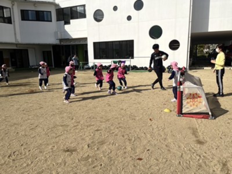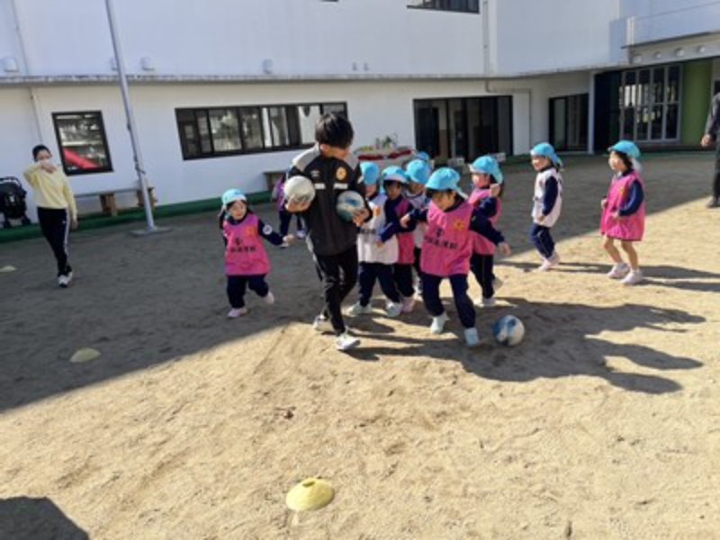 アルバム “ギラヴァンツ北九州”のコーチとサッカー教室 2025/11/10 “ギラヴァンツ北九州”の「しゅうコーチ」と「じんコーチ」が幼稚園に来てくださり、 年長さんがサッカー教室に参加しました。 かっこいいビブスを着て、みんなのやる気も急上昇! まずは、鬼ごっこでウオーミングアップ。走りながら楽しい声も聞こえてきました。 「サッカーは足を使ってするんだよ」と教えてもらって、ボールを蹴ったり、止めたりとチャレンジし、みんなとっても上手でした! チーム対抗でミニ試合も行い、ゴール目掛けてボールを蹴っていました!キーパーになってゴールを守る姿もありましたよ!サッカー教室は終わっても、まだまだ一緒に過ごしたい子どもたち♬優しいコーチお二人はみんなと給食も食べてくれました。 子ども達が作ったお礼のサッカーのペンダントも喜んでくれてよかったです。とても楽しいサッカー経験ができましたね。 << 一覧に戻る