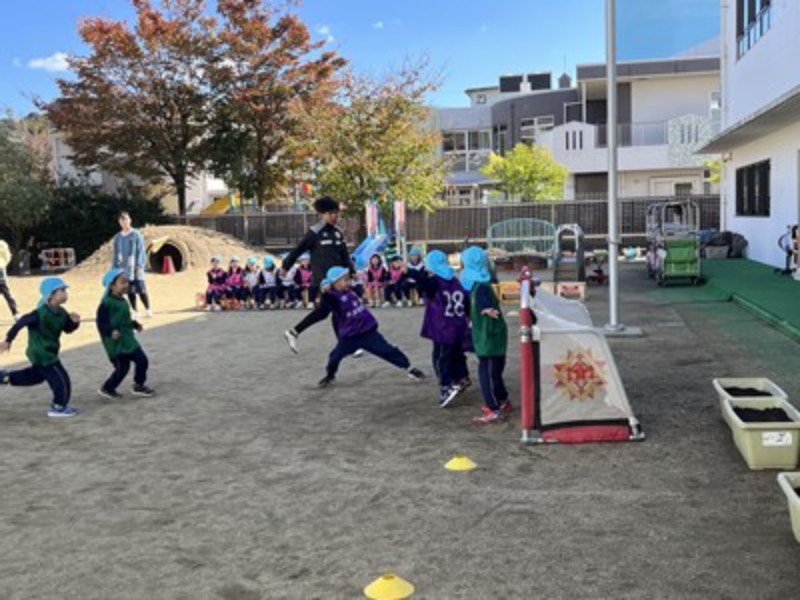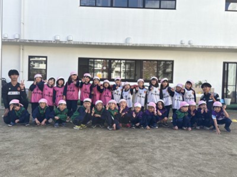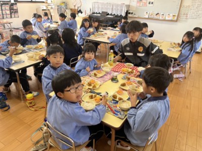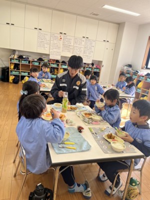 チーム対抗でミニ試合も行い、ゴール目掛けてボールを蹴っていました!キーパーになってゴールを守る姿もありましたよ!サッカー教室は終わっても、まだまだ一緒に過ごしたい子どもたち♬優しいコーチお二人はみんなと給食も食べてくれました。