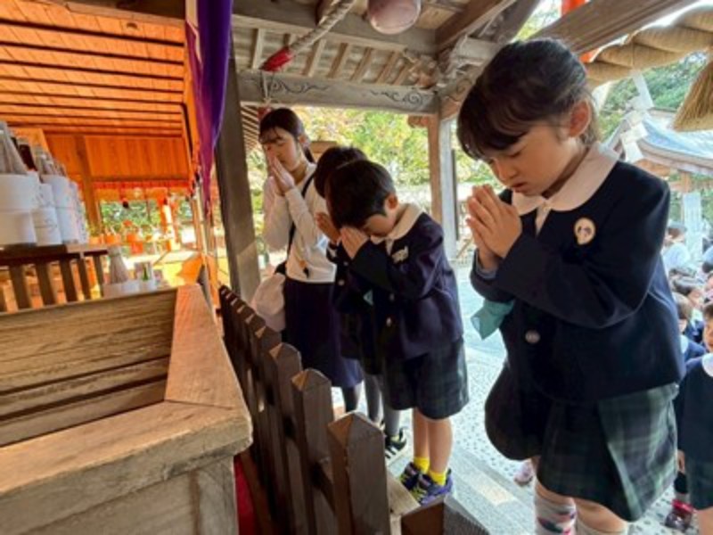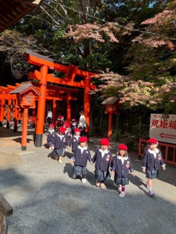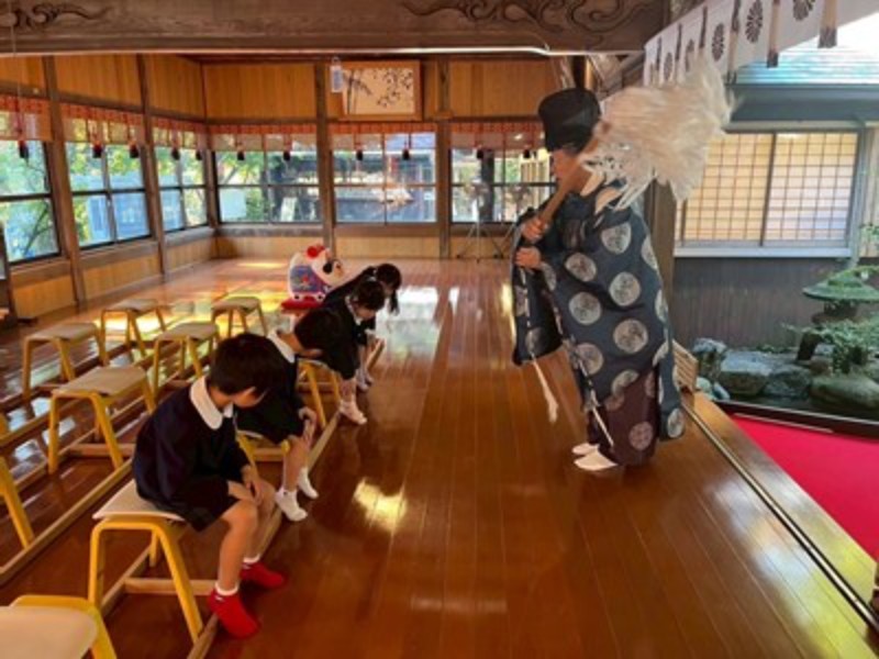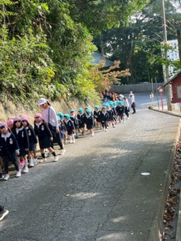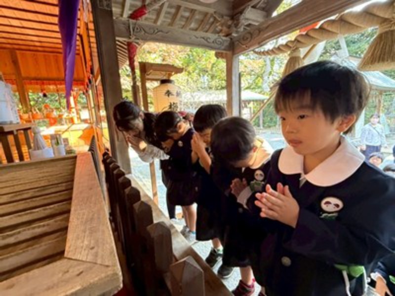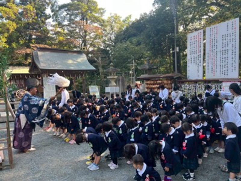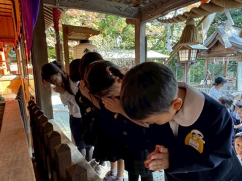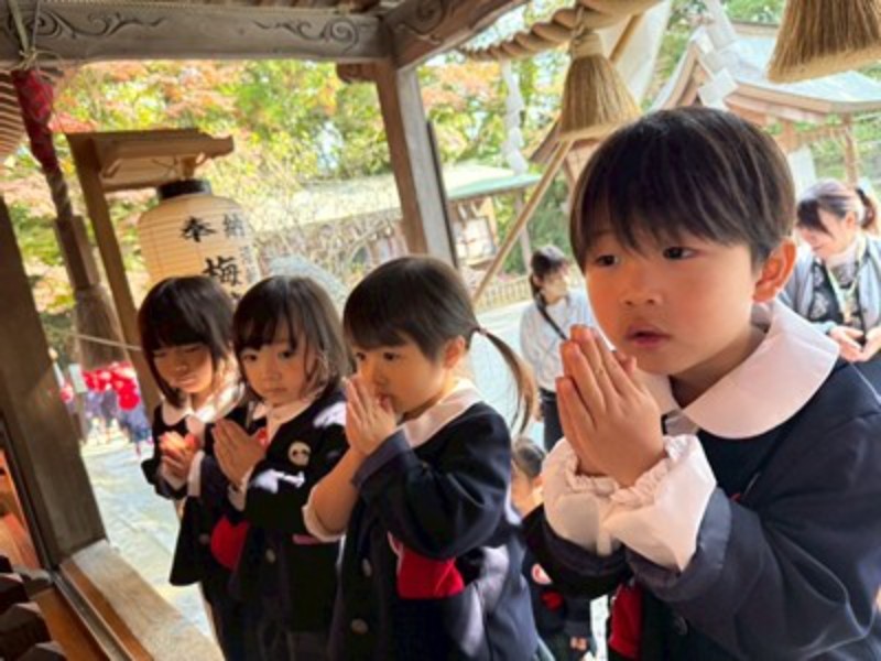 秋晴れの良い天気に恵まれて、年長・年中さんは徒歩で、年少さんはバスで神社に向かいました。神主さんからお祓いをしてもらい、成長祈願をしました。