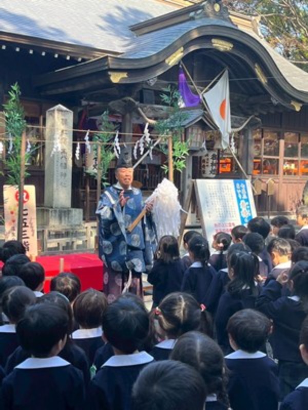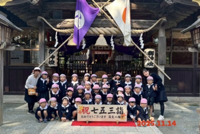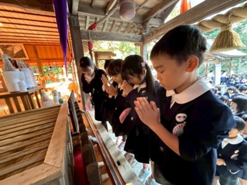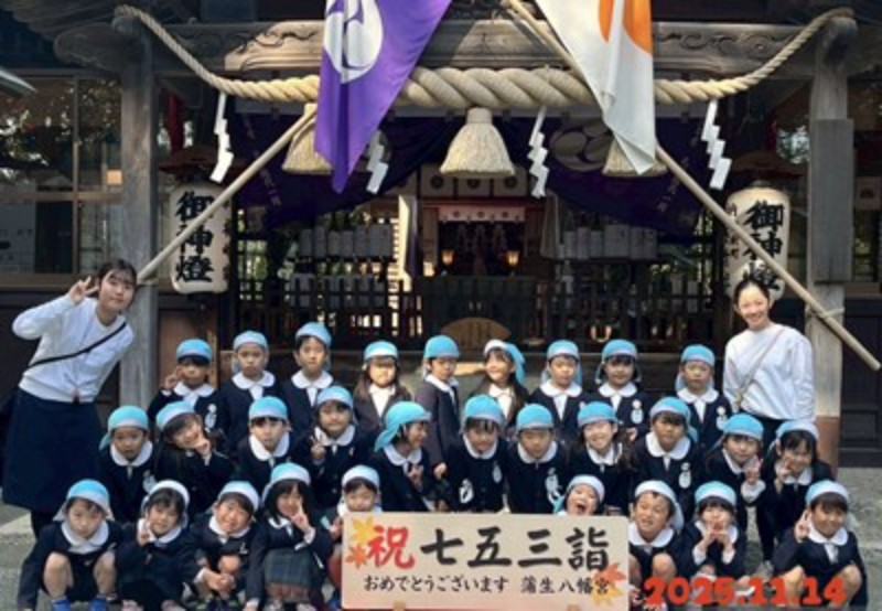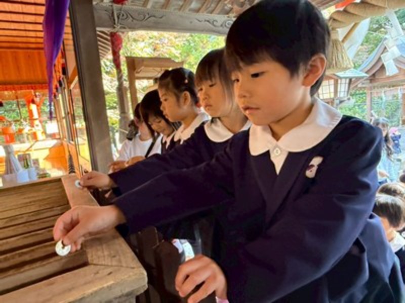 アルバム 七五三のお参りに行ってきました 2025/11/14 明日は七五三のお祝いの日ですね。 今日、幼稚園のお友だちは蒲生神社に、りす・うさぎ・ひよこ組さんは、ヒトノワの前のお地蔵様にお参りに行ってきました。 秋晴れの良い天気に恵まれて、年長・年中さんは徒歩で、年少さんはバスで神社に向かいました。神主さんからお祓いをしてもらい、成長祈願をしました。 お賽銭を一人ずつ入れて、「おおきくなりたいです」とそれぞれのお願いをしていました。りす・うさぎ・ひよこさんも先生と一緒に手を合わせていましたよ。 園長先生からお祝いの千歳飴ももらって喜んでいました。 健やかに大きくなりますように。 << 一覧に戻る