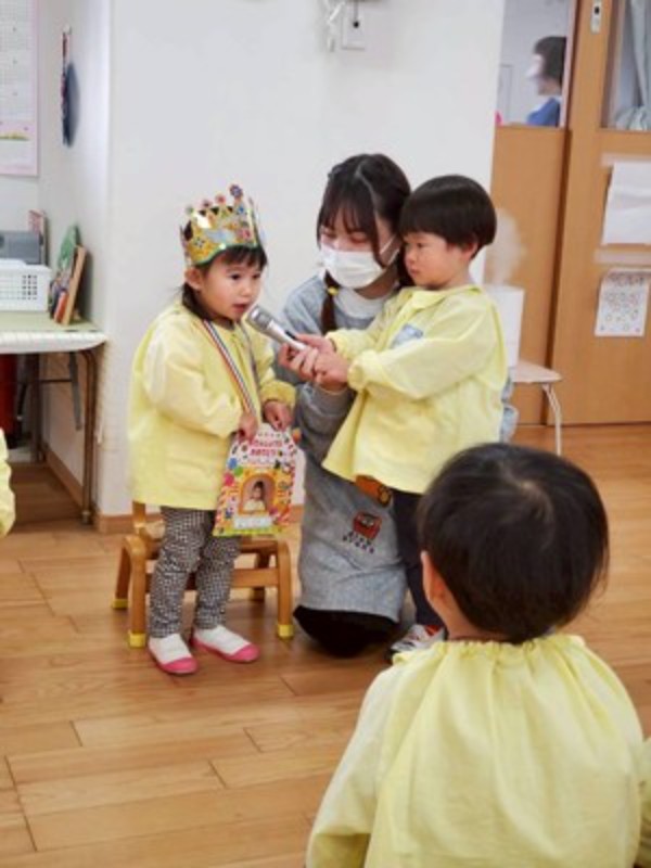 誕生会は、大好きなお友達に聞きたいことがいっぱいあって、質問コーナーではほとんどのお友達が手を挙げています。