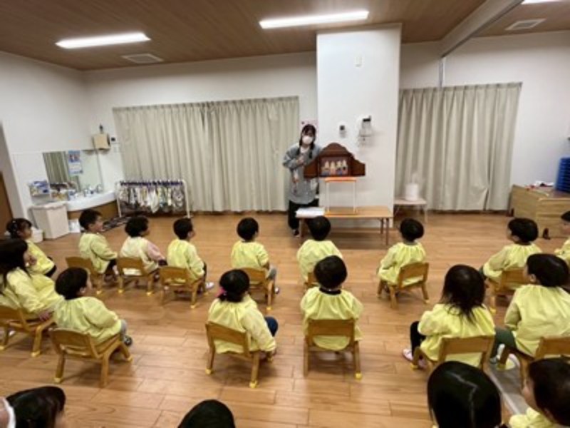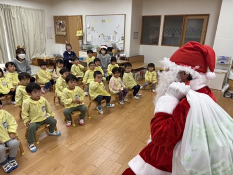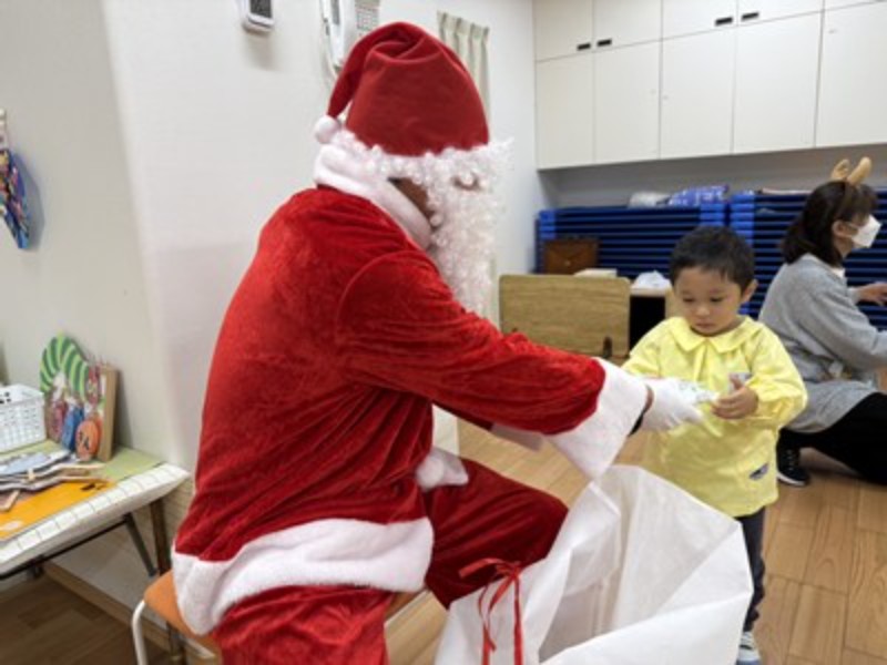 クリスマス会では、『サンタさんのふしぎなおもちゃマシン』のお話しを聞いた後、本物のサンタさんが登場!『ドキドキしたぁ』とちょっぴり緊張しながらも、プレゼントをもらいましたよ♪