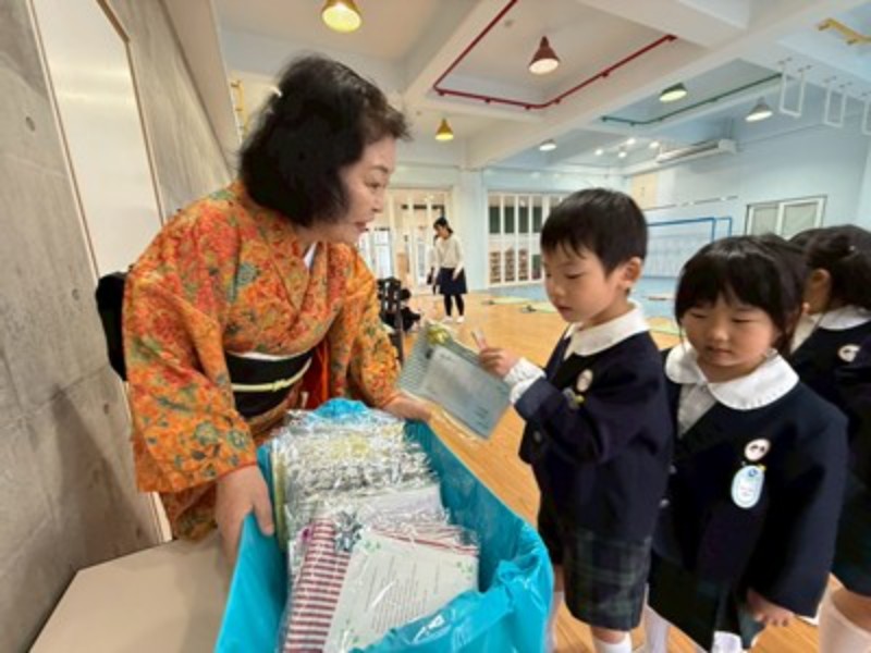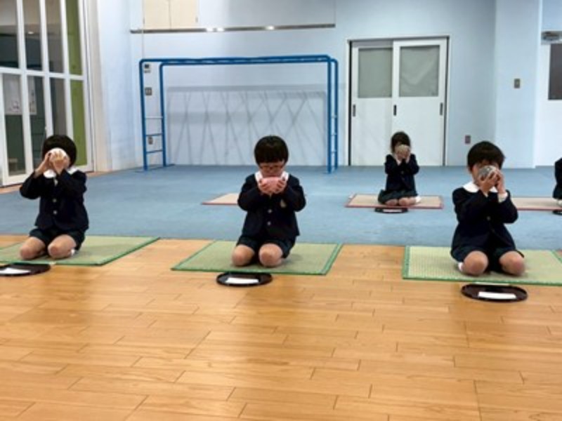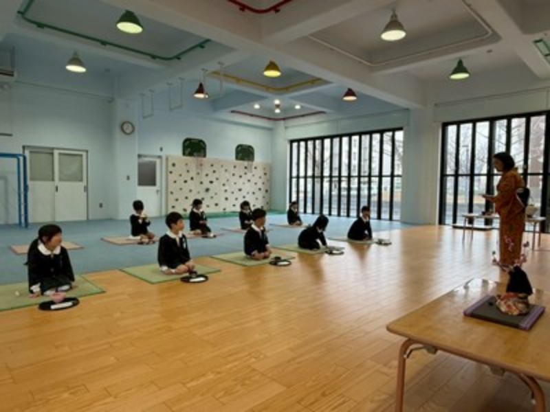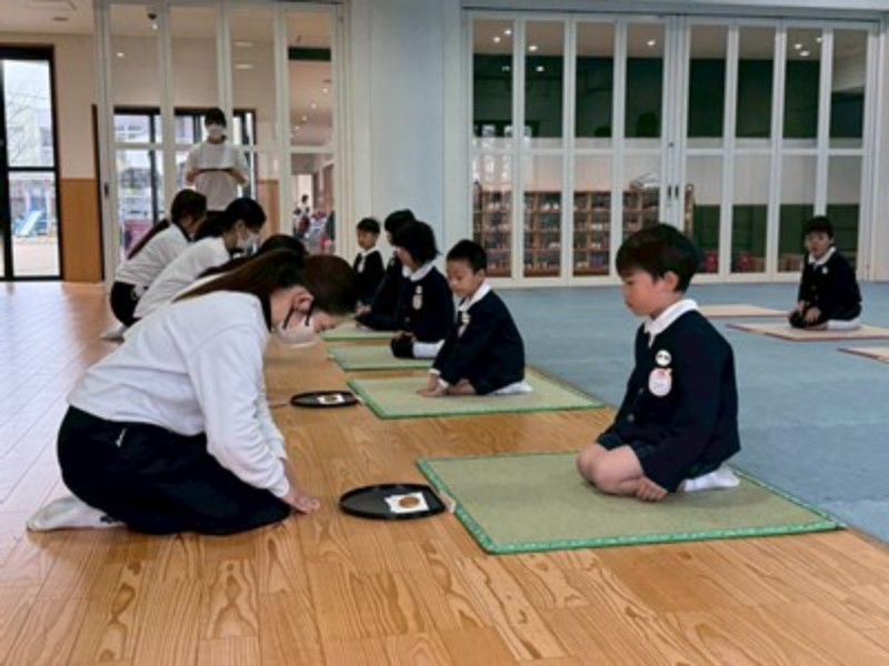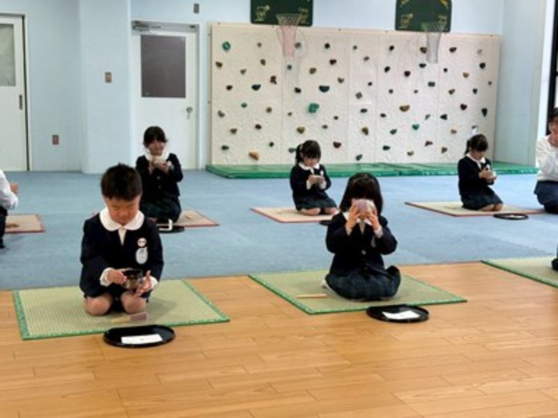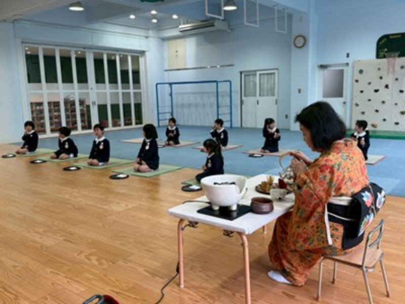 アルバム 園長先生と「おわかれお茶会」 2026/03/02 もうすぐ卒園を迎える年長さんに、今年も園長先生が「おわかれお茶会」を開いてくださり、美味しいお抹茶を点ててくださいました。 プレイルームのお茶室で扇子を持って畳に座り、和菓子に「おいしい!」と緊張の中にも笑顔が見えていましたよ。ご挨拶の「お点前ちょうだいいたします」も上手にできました。いつも飲むお茶とは違うお抹茶の味も味わえてよい体験ができました。 日本の文化に触れ、お茶の道具や、お作法なども知ることができました。 最後は、園長先生の手作りの『ランチョンマット』をいただき、みんな大喜びで見せ合っていました♪学校への期待も膨らんだ「春のお茶会」となりました。 << 一覧に戻る