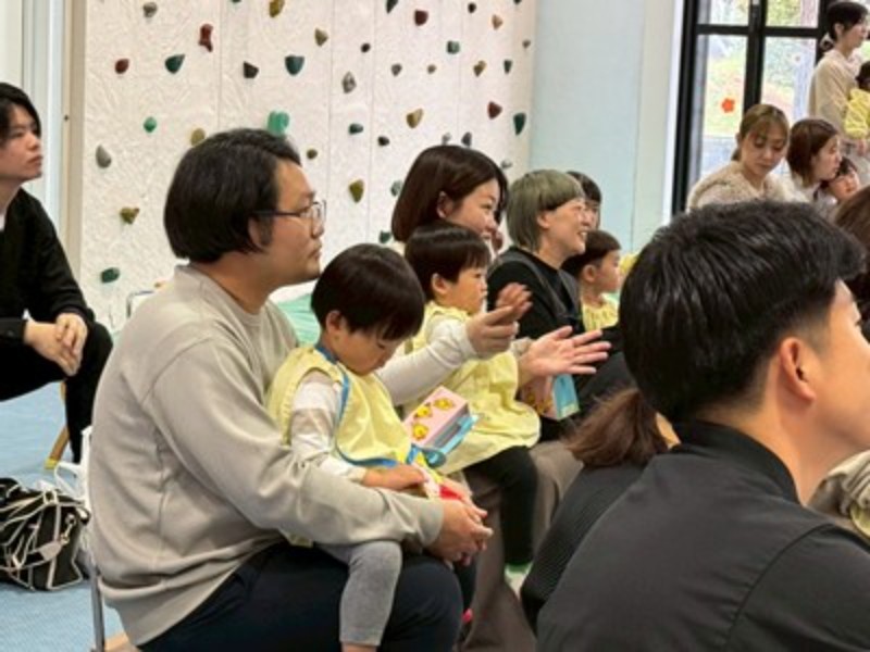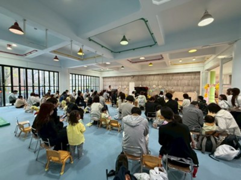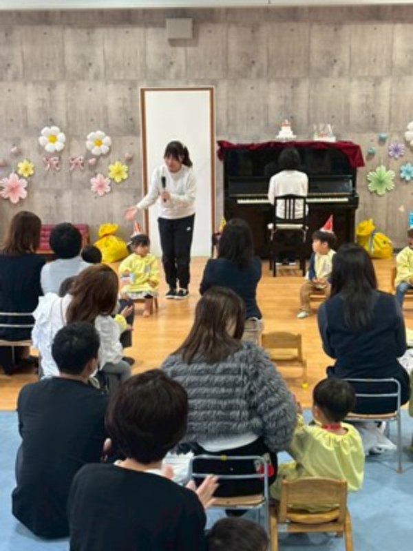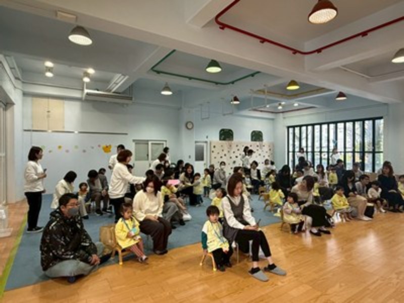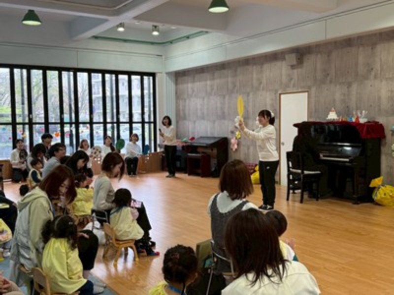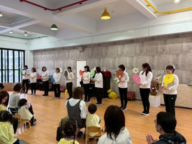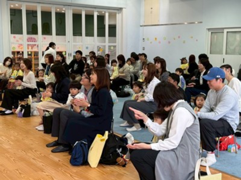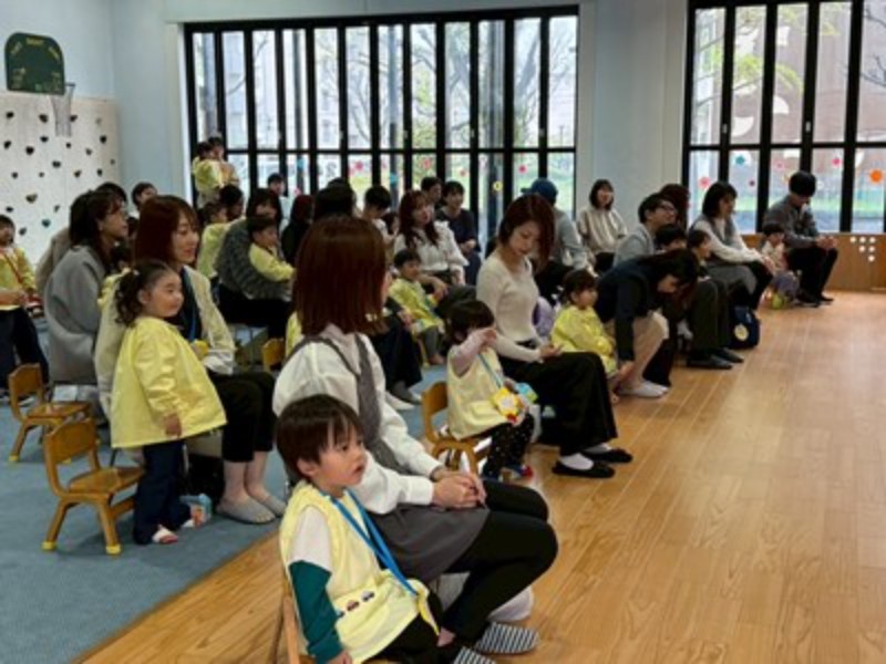 先生達のハンドベルの音色で会のはじまりはじまり♬ふうせんの歌でひよこ組の先生達の紹介をして「明日からたくさん遊ぼうね!」とお話をしました。