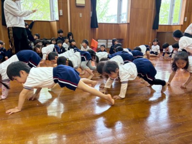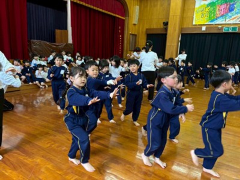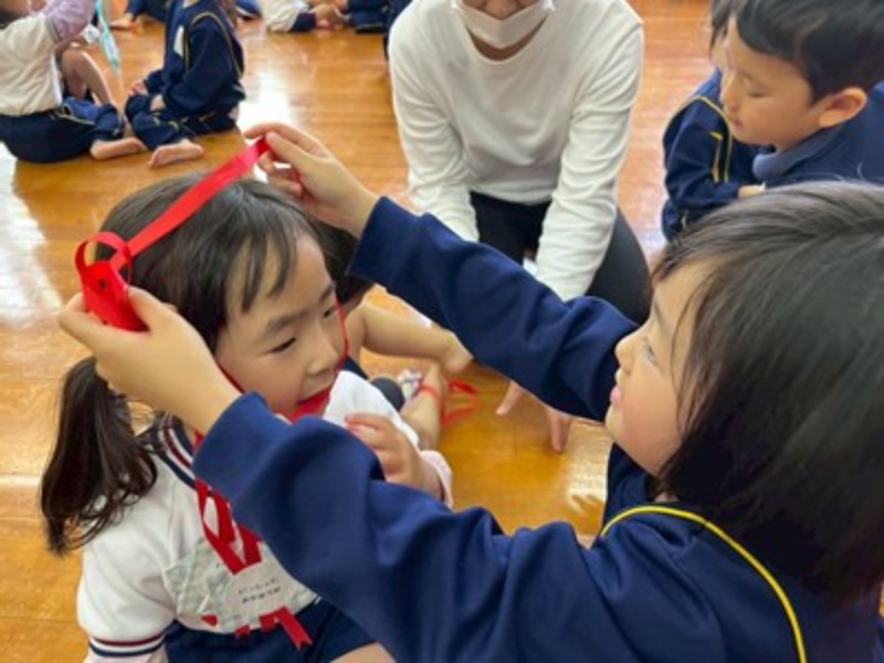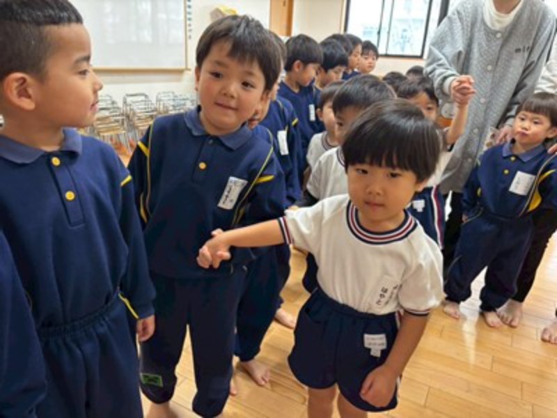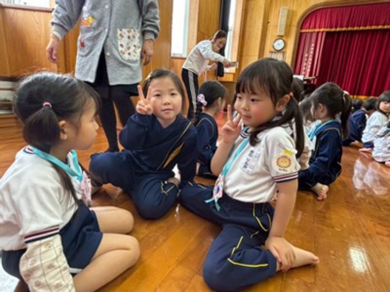 アルバム 対面式~みんなよろしくね♫ 2026/04/17 幼稚園部のお友だちみんなで、対面式を行いました♪リーダーになった年長さんは、年少さんのお部屋まで迎えに行き、年中さんが待っている遊戯室まで優しく手を繋いで連れてきてくれましたよ。広いお遊戯室で、春の歌を歌ったり先生の自己紹介で名前や顔を覚えたり、元気な声がたくさん聞こえました! それからは、園で取り組んでいる『さくらさくらんぼリズム』をして遊びました♪初めは、年長さんがお手本を見せてくれて、ピアノに合わせて体を動かすお兄さんお姉さんを憧れの眼差しで見る年中さんも、次は自分の番!と、ピアノの音をよく聞いて、自然と体が動いていました。最後は、年長、年中の姿を見て待ちかねて、まねっこをして上手にうさぎや馬に変身する年少さん!また一緒に集えるのが楽しみになりました。 帰りに、年長さんが作ったペンダントをかけてもらって、手を繋いでもらって、」小さなお友だちはニコニコで笑顔の花が咲いていました♪これからたくさん一緒に遊びましょうね♫ << 一覧に戻る