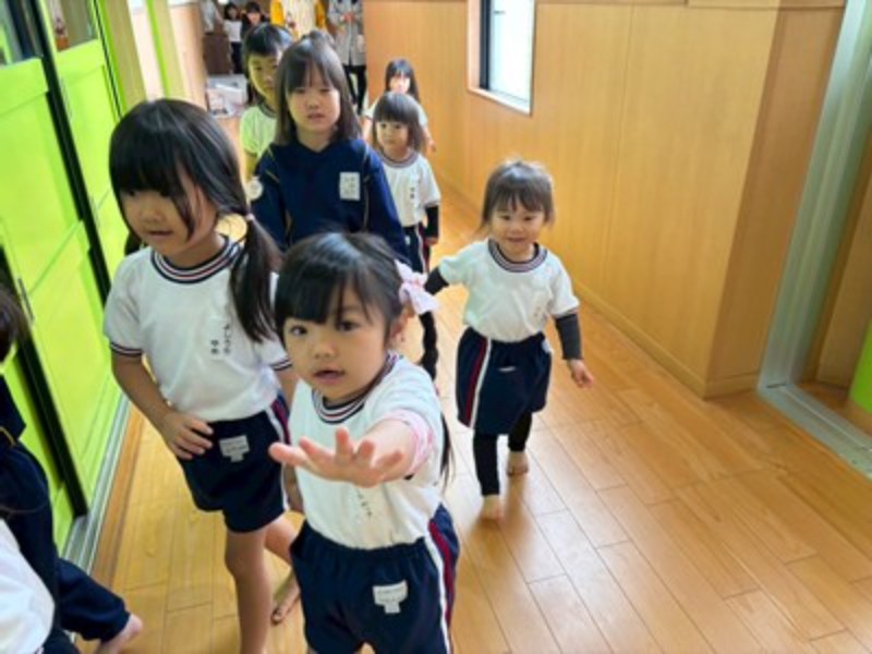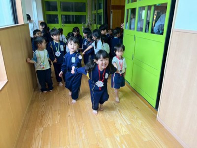 リーダーになった年長さんは、年少さんのお部屋まで迎えに行き、年中さんが待っている遊戯室まで優しく手を繋いで連れてきてくれましたよ。広いお遊戯室で、春の歌を歌ったり先生の自己紹介で名前や顔を覚えたり、元気な声がたくさん聞こえました!